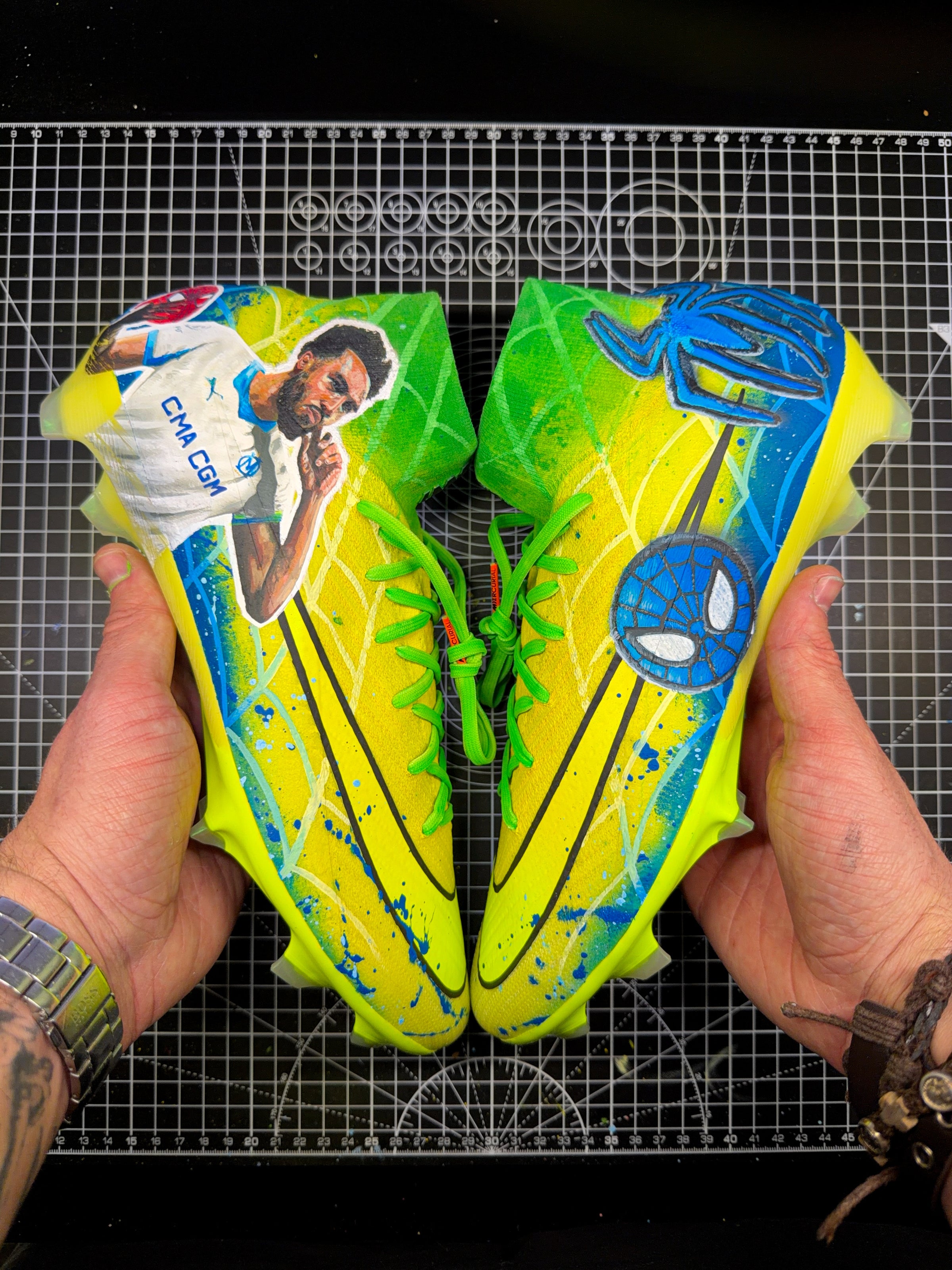 for ligue 1 mcdonald’s, cam collaborated with samba digital to create a bespoke pair of football boots celebrating pierre-emerick aubameyang ahead of the africa cup of nations. the design combined gabon’s national colours with his iconic spiderman celebration.