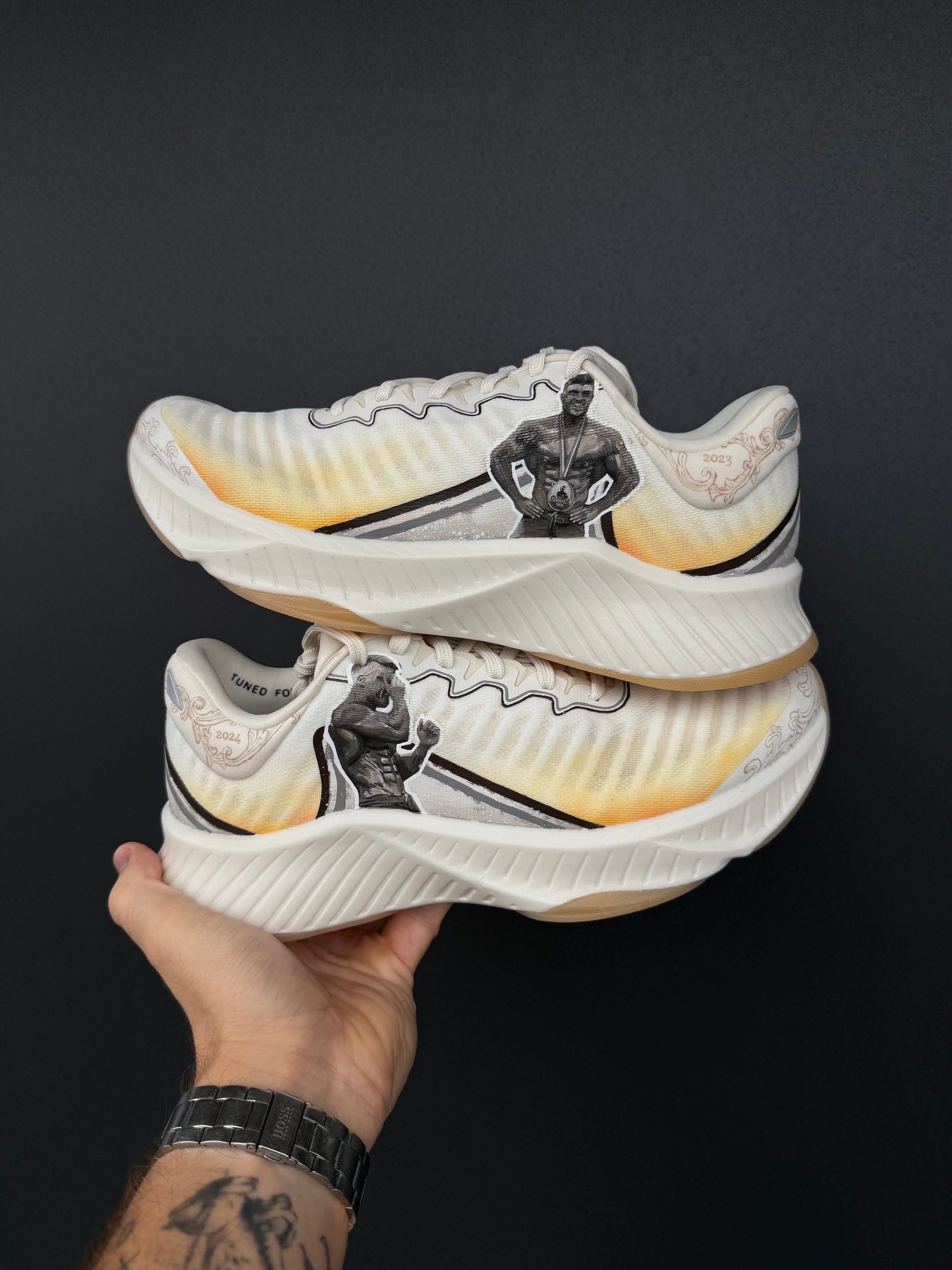 mattbcustoms commissioned cam to hand-paint a 1 of 1 pair of gymshark shoes celebrating ryan terry’s third mr olympia title in 2025.